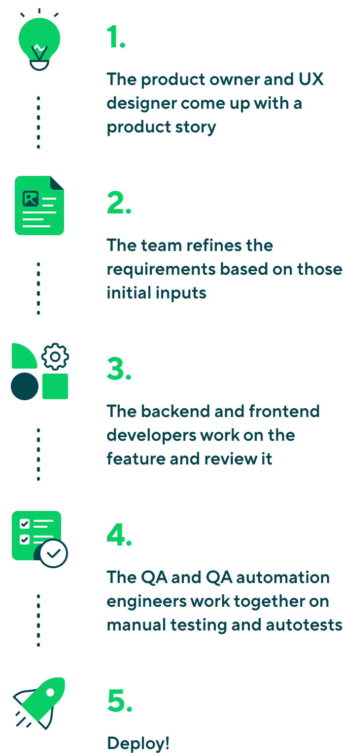 Internal teams speed up development processes, ensuring system flexibility, stable code base, and quality adherence. This is achieved through tooling, platform refinements, shared libraries (like our UI Kit), and devtools. Other specialized teams, such as DevOps, ITOps, SysOps, and SecOps, ensure infrastructure and security. Expert architects oversee the product cross-functionally.