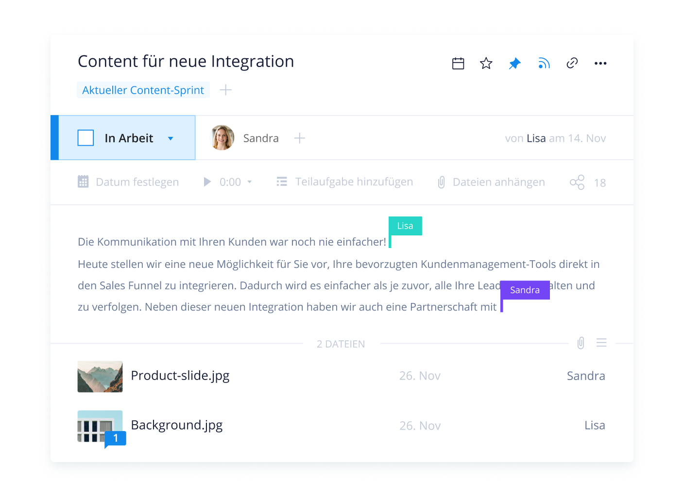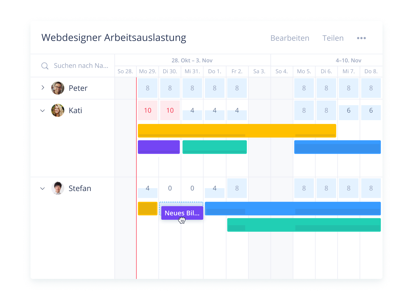 Teilen Sie Ihre Projekte in konkrete Aktionspunkte ein, weisen Sie Aufgaben den richtigen Mitarbeitern zu und visualisieren Sie Deadlines in einer Zeitleisten-Ansicht.