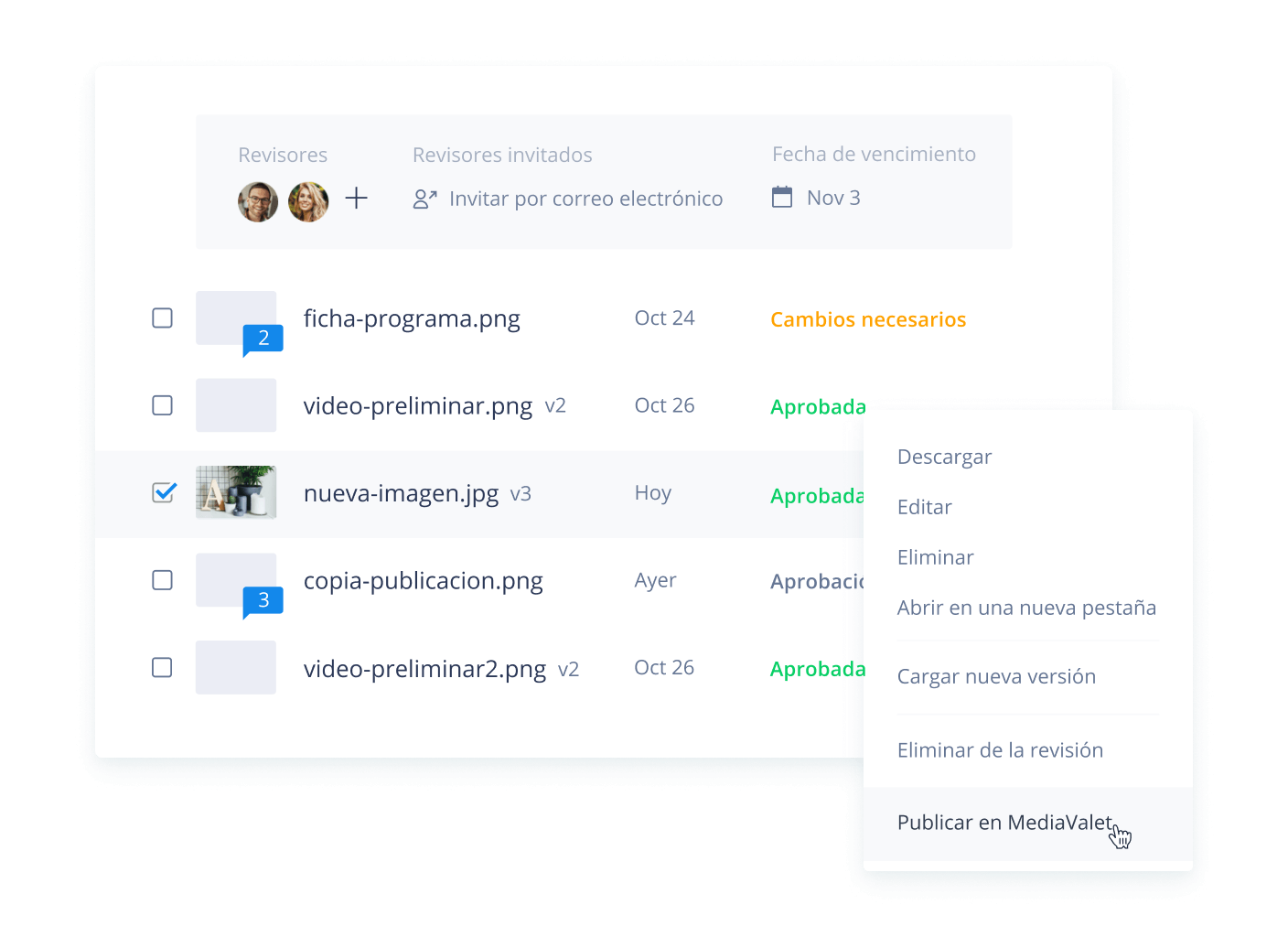 Acelera la creación de activos con herramientas integradas de aprobación, revisión y publicación y una integración con Adobe Creative Cloud.