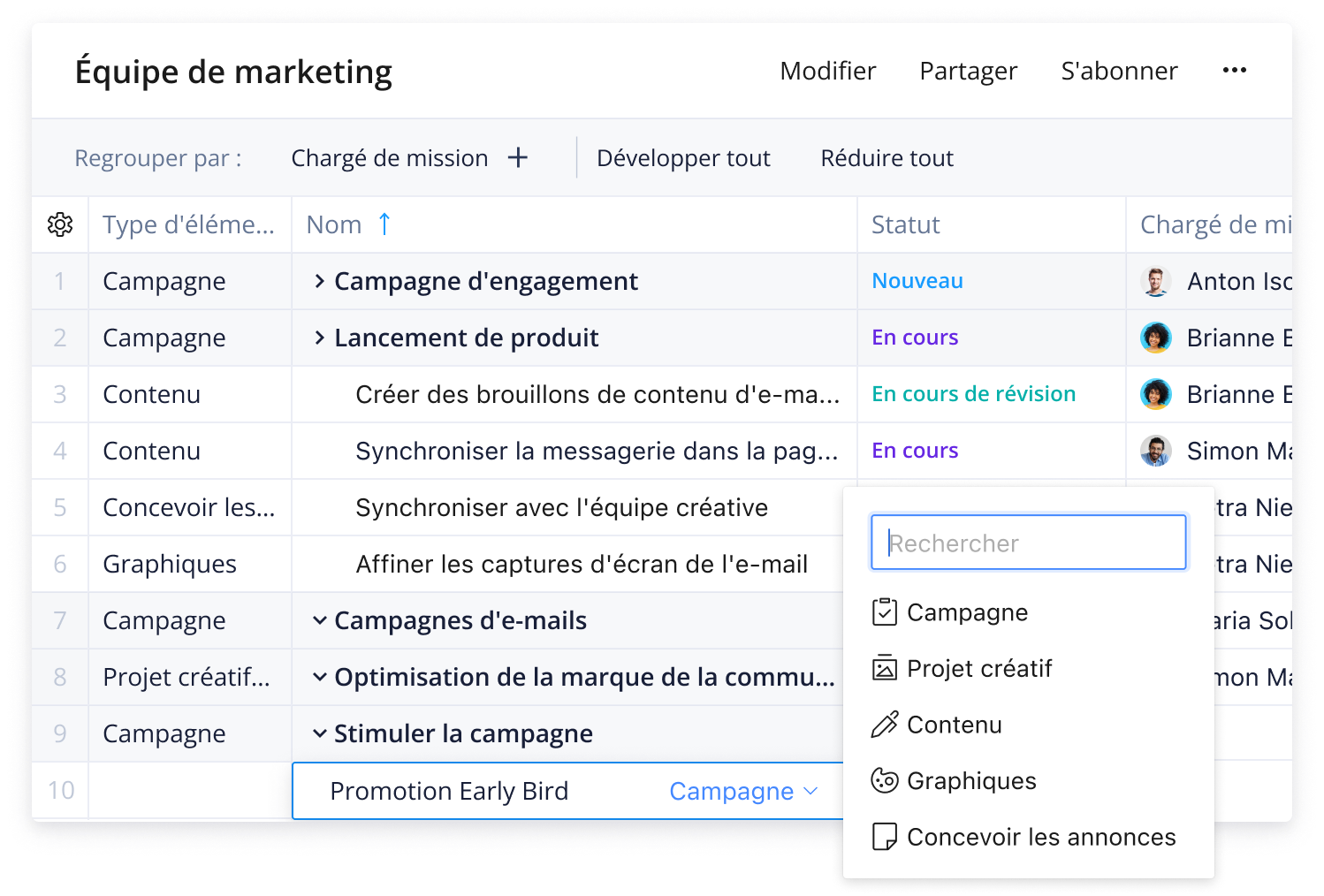 Configurez votre espace de travail en fonction de la façon de travailler de votre équipe. Tableaux de bord personnalisables, flux de travail spécifiques, calendriers partagés et nombre d'autres options facilitent l'organisation des informations dans les espaces, les dossiers, les projets... pour s'adapter aux besoins liés aux processus de travail de chaque équipe. C'est Wrike qui s'adapte à vous, et non l'inverse.