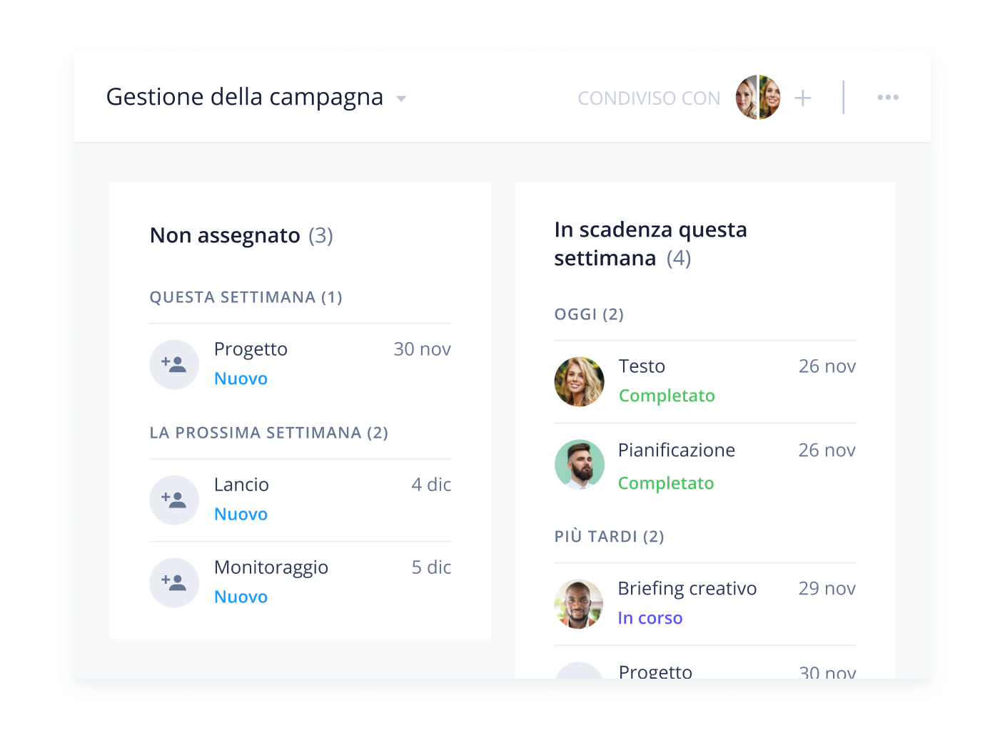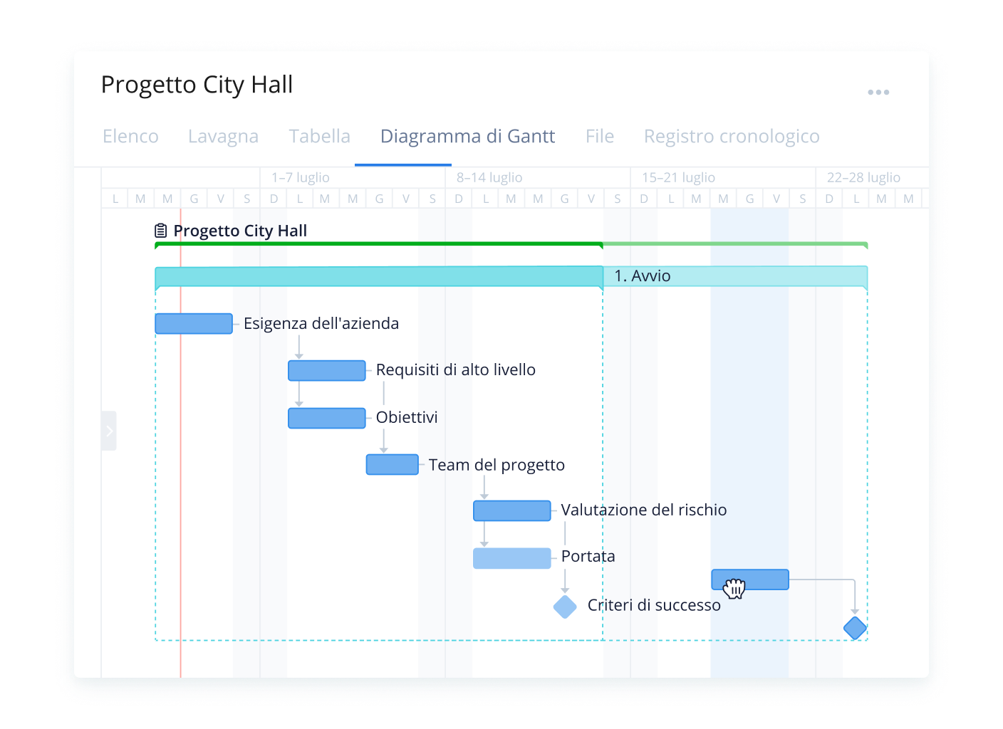Dividi i progetti in elementi gestibili, assegna le date di scadenza e tieni traccia dell'avanzamento su un diagramma di Gantt.