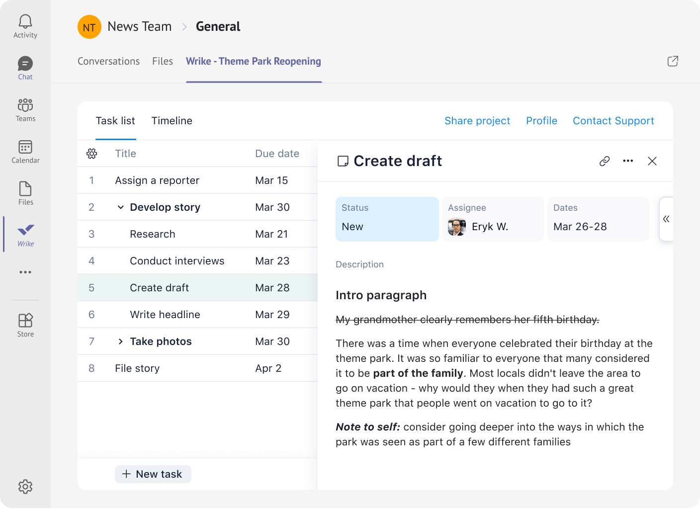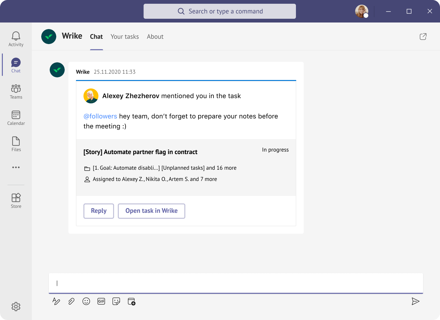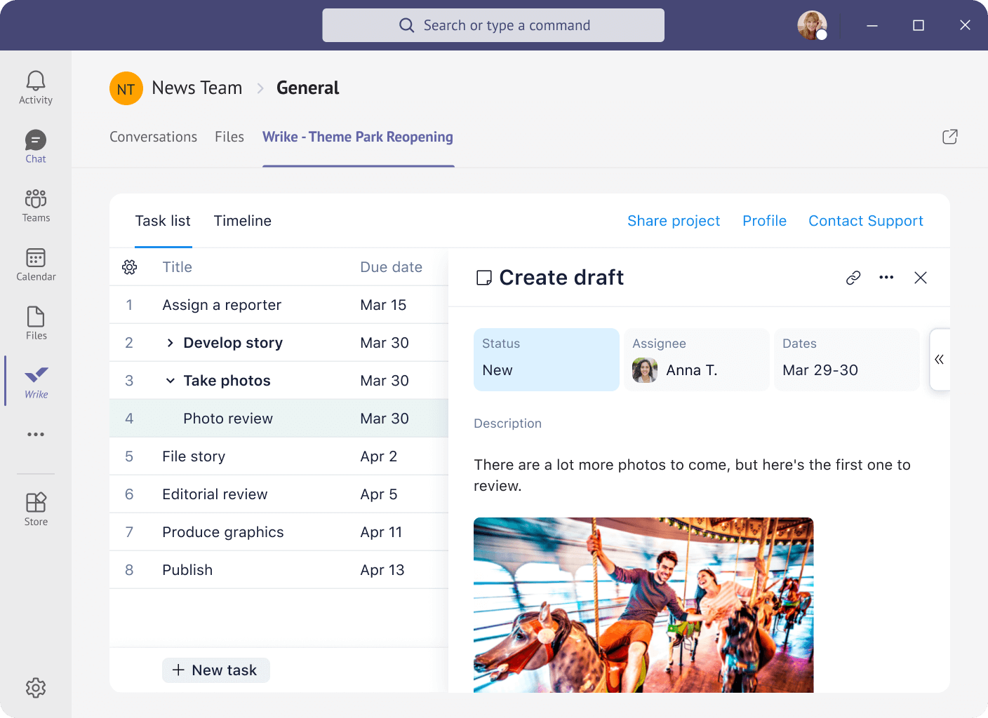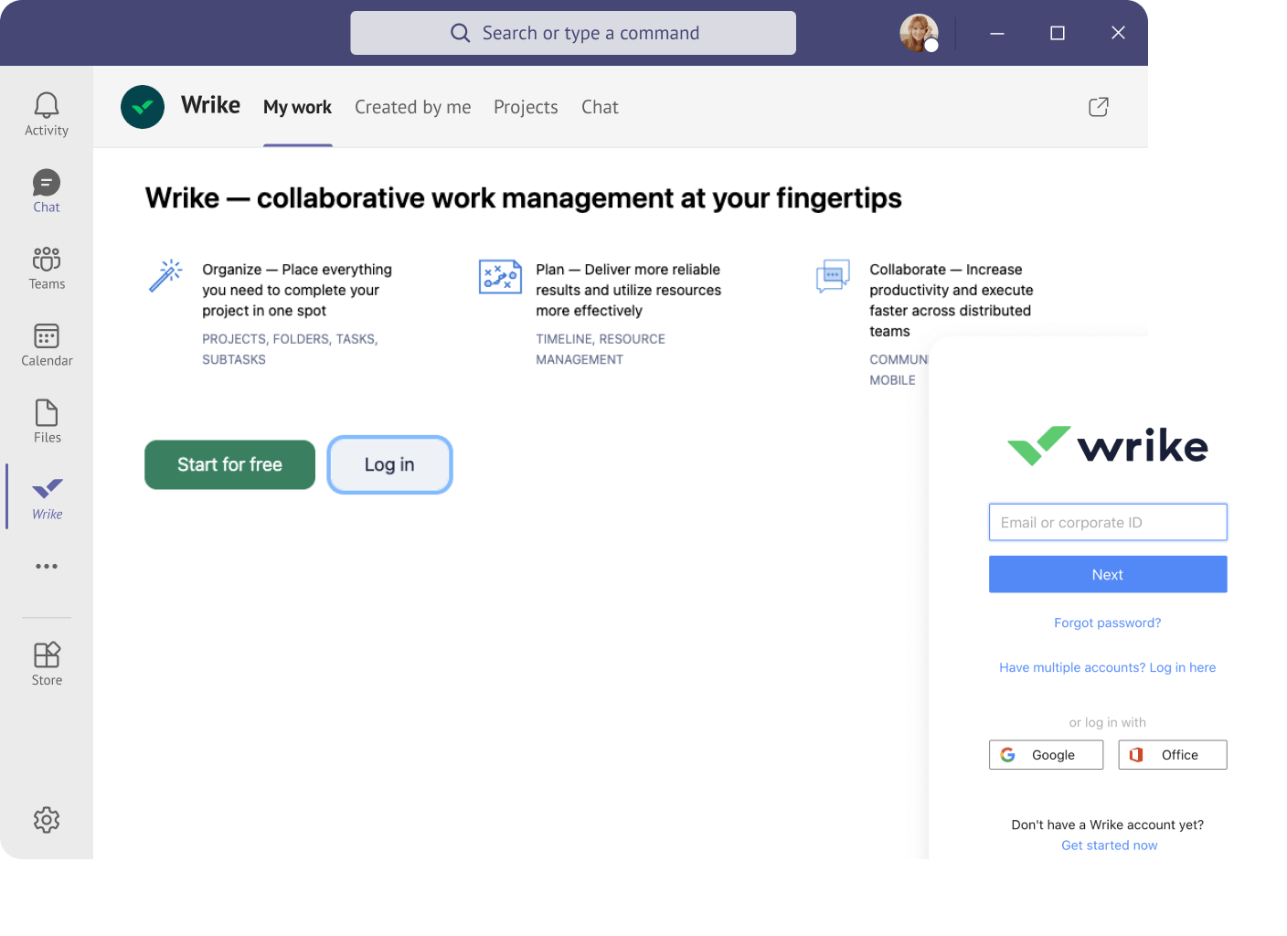 Connect your Wrike account to Microsoft Teams by navigating to the Teams store and installing the Wrike application. Add a Wrike project as a tab in your channel so you can view project details without leaving the Teams app.