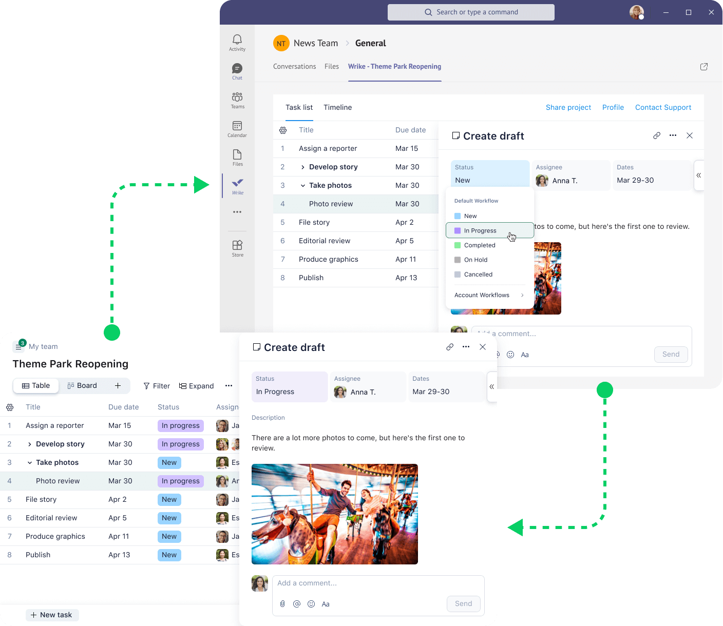 Once you’ve installed the Wrike add-on for Teams, you can update assignees, due dates, and statuses for project tasks. You can also view project dashboards within the Teams app.