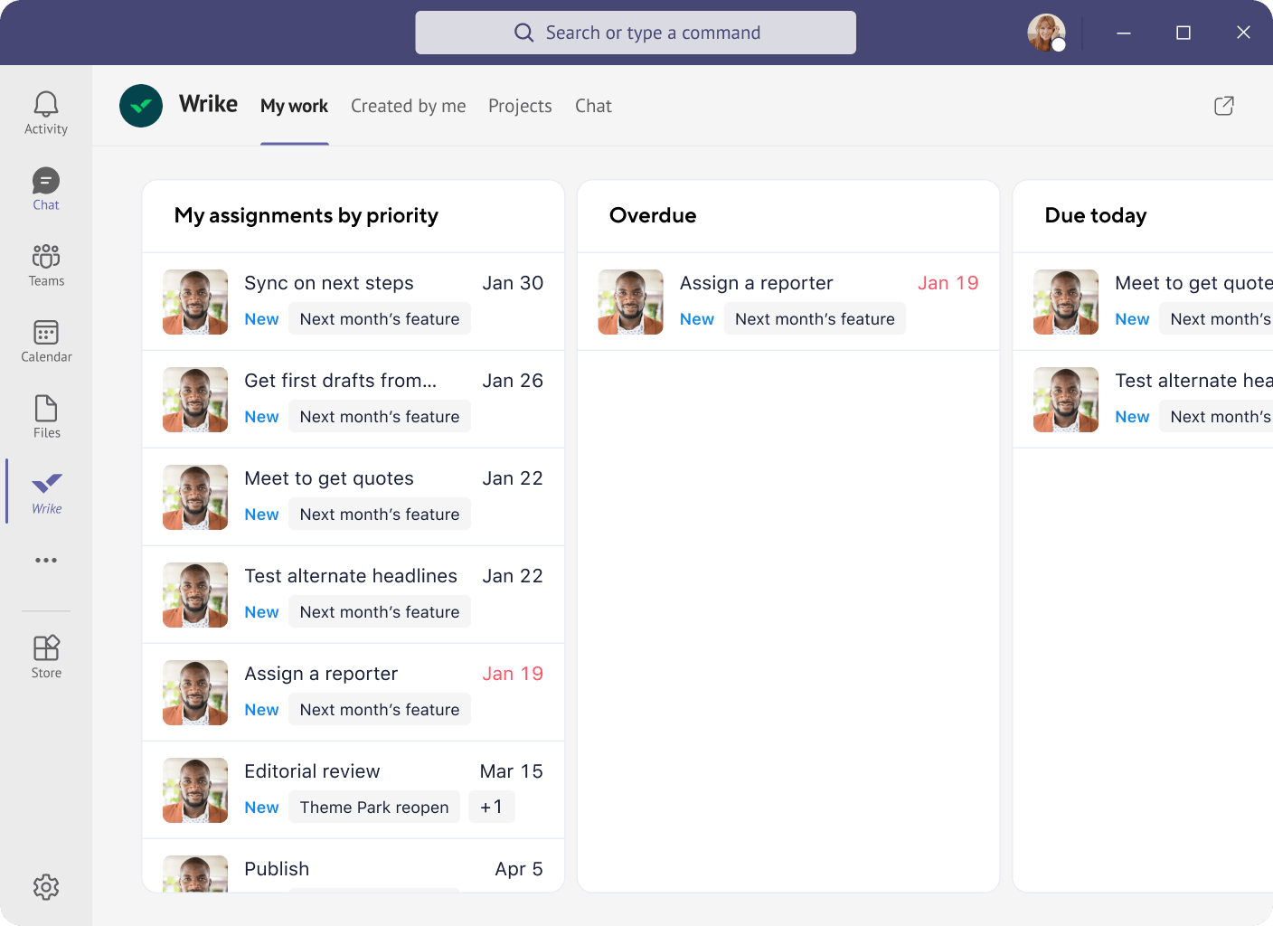 Yes, it is possible to access Wrike through the Teams app. Wrike and Teams integrate seamlessly, allowing you to search for tasks, manage tasks, and share tasks in ongoing communications — all within the Teams app.