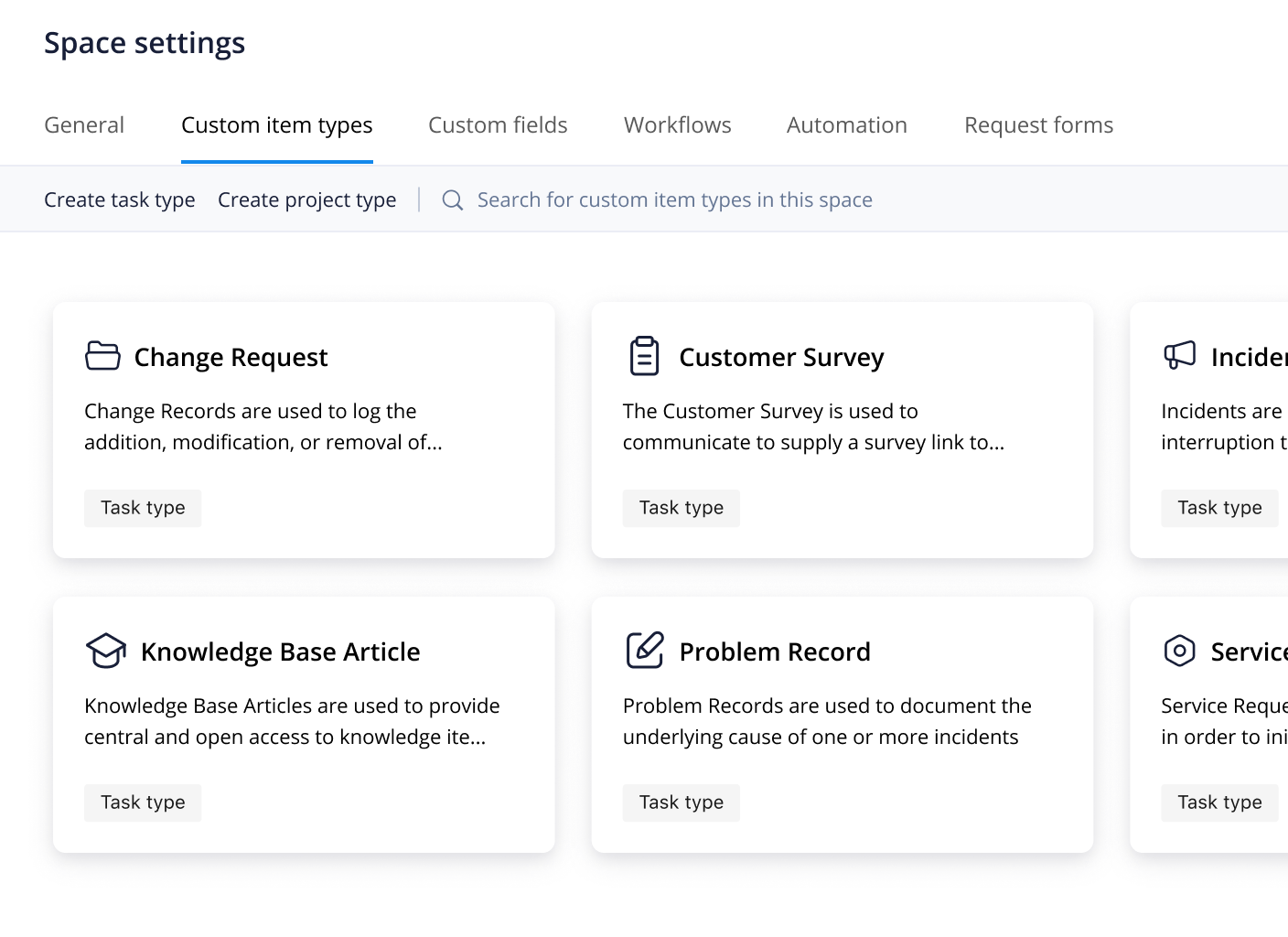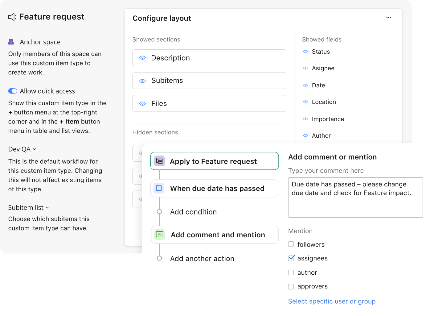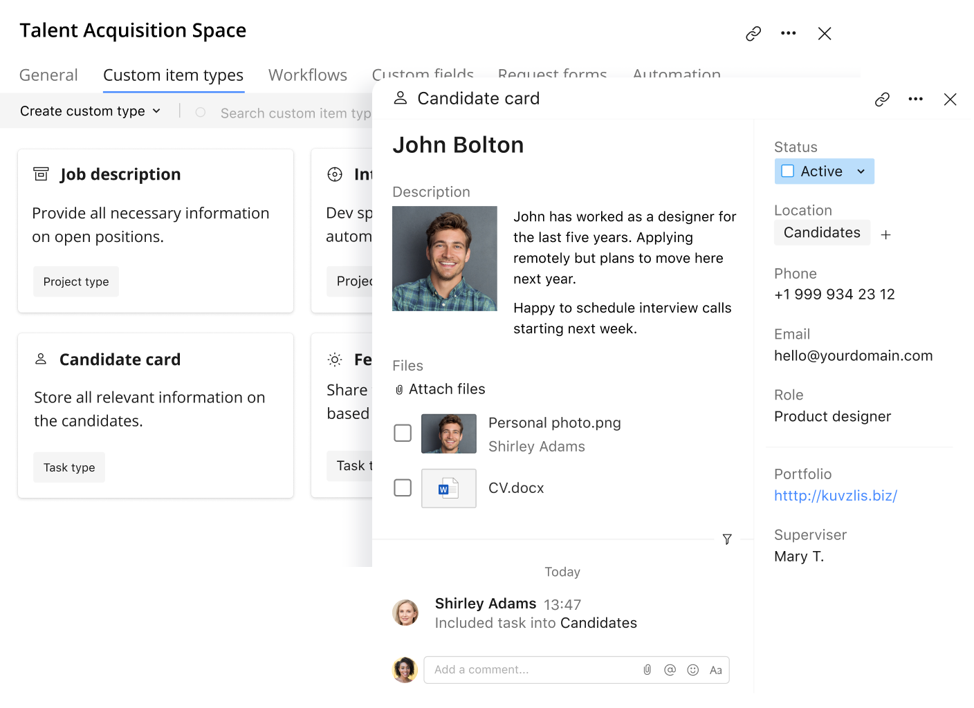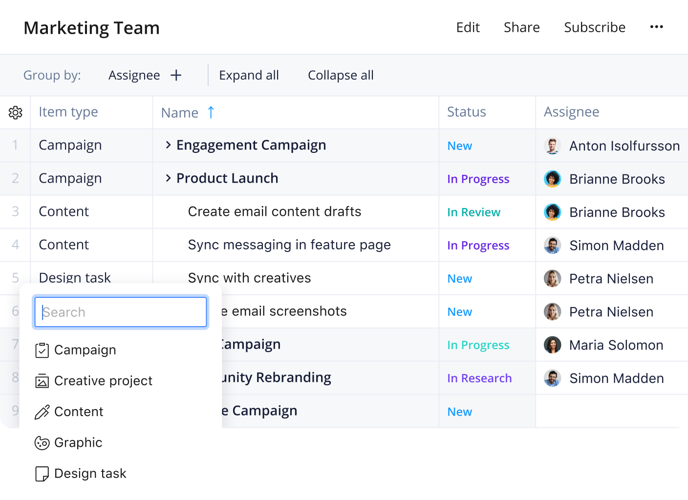 Keep track of meeting minutes, project files, and more with custom item types. Workspace members can view and access the information they need, be it a creative brief or a user story.