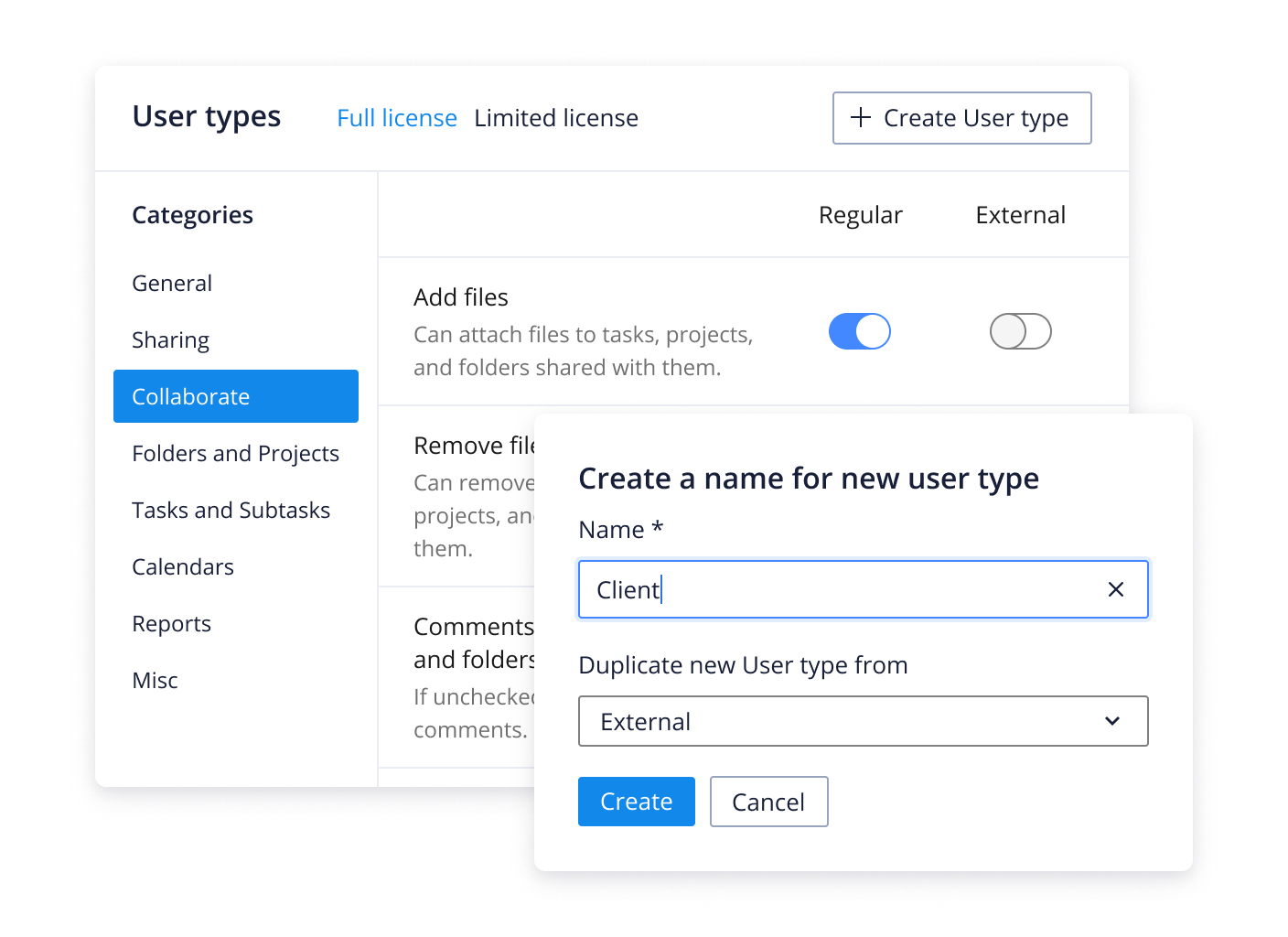 Create, duplicate, and manage user types. Set relevant permissions based on license type and account role, simplifying the onboarding process.