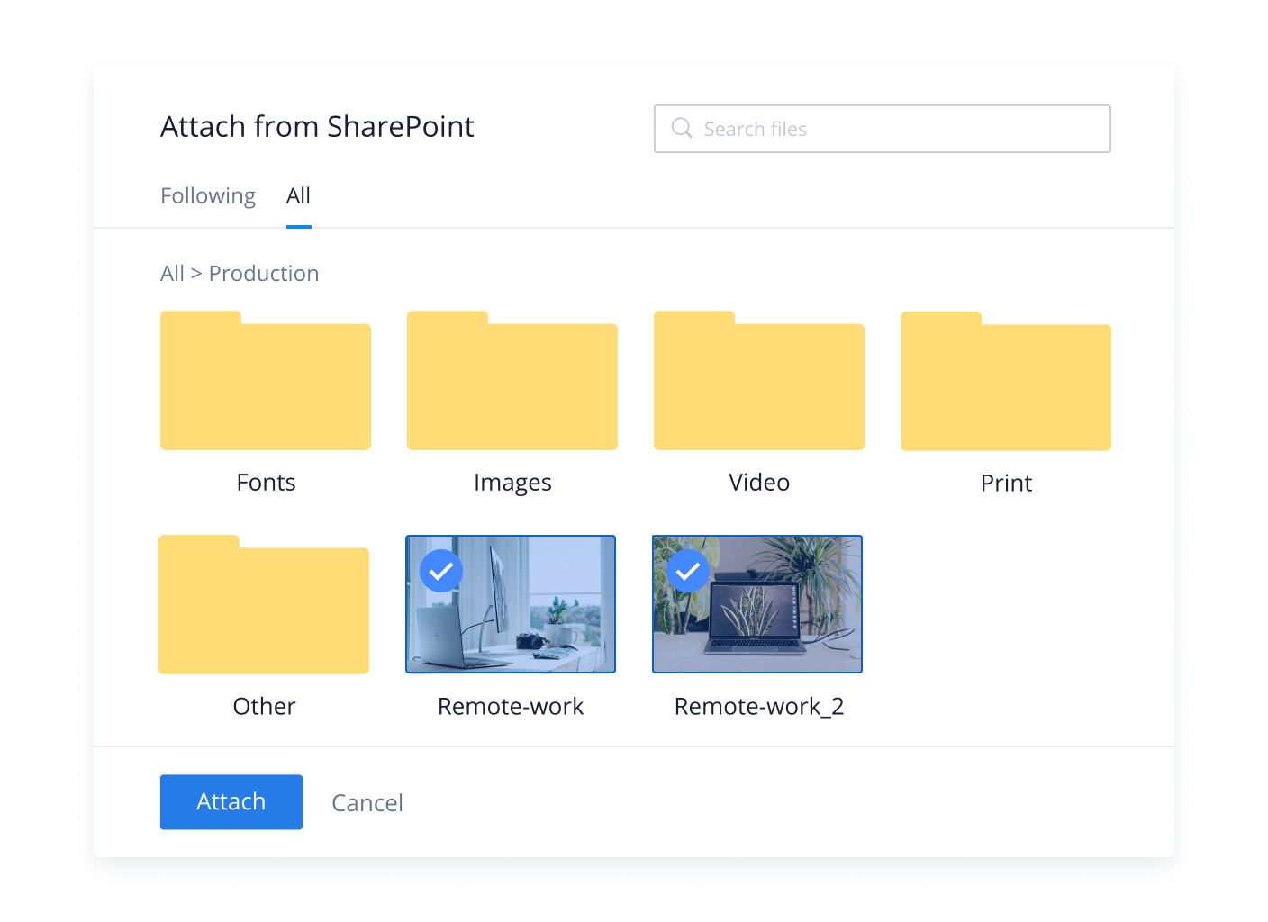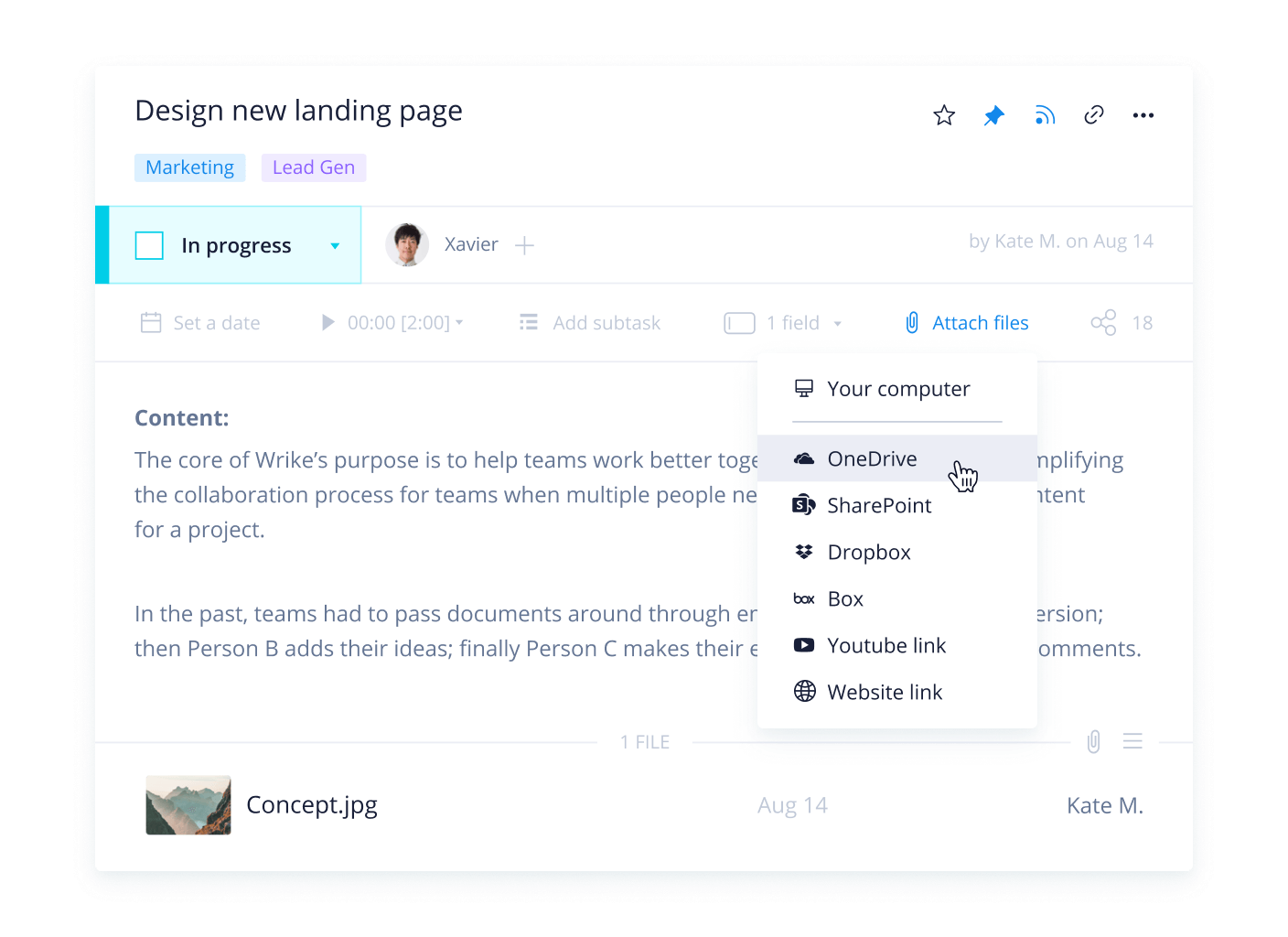 Add documents, provide instant access to files and manage internal content with Wrike and SharePoint.