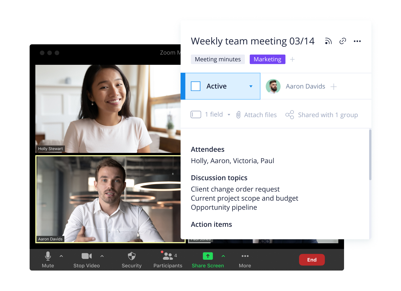 Work in Wrike without leaving Zoom. Take notes, capture action items, assign owners and set due dates in real time.