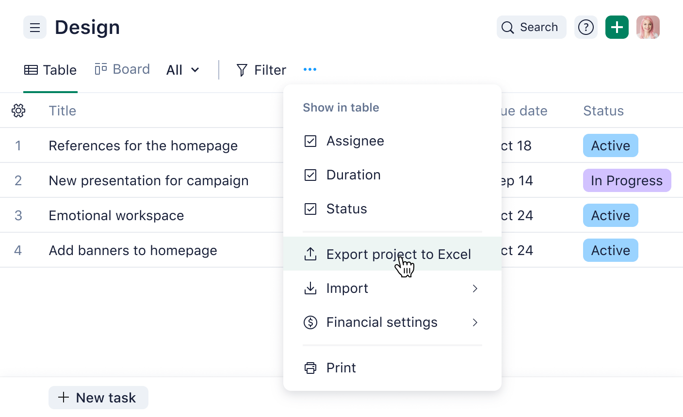 Navigate to the Project or Folder you’d like to export into Excel. In the upper right hand corner of your workspace, find the three dots. There, you’ll be given the option to export. Choose Excel and download the file.