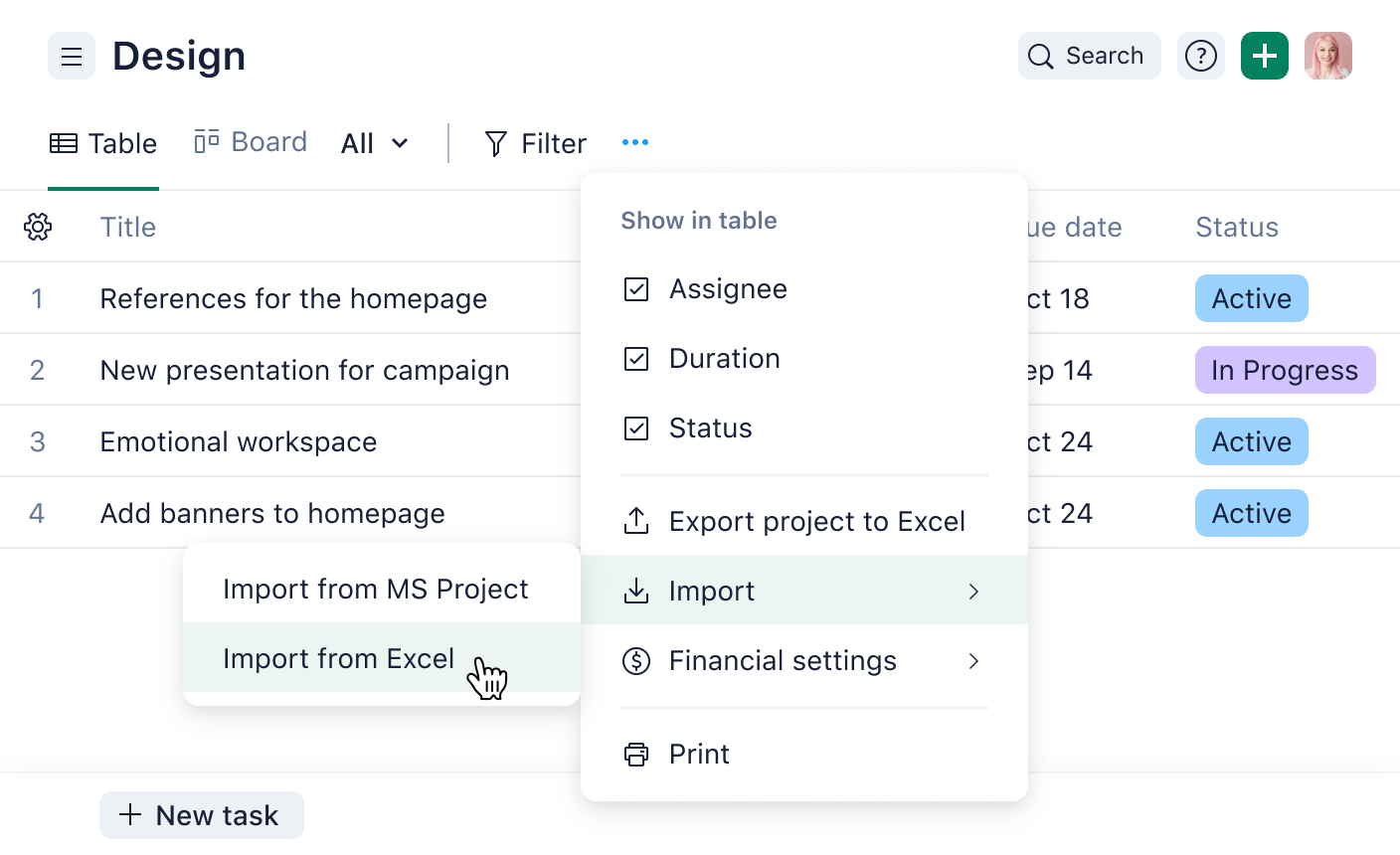Import Excel sheets into Wrike by creating a new file (.xls or .xlsx) and adding details like title, status, assignee, and more. When you’ve done that, open Wrike and navigate to the Space, Project, or Folder where you’d like your new Excel-generated task to live. Click on the three dots in the upper right hand of your work space and choose “Import” and then “Excel”. Select your file and get started.